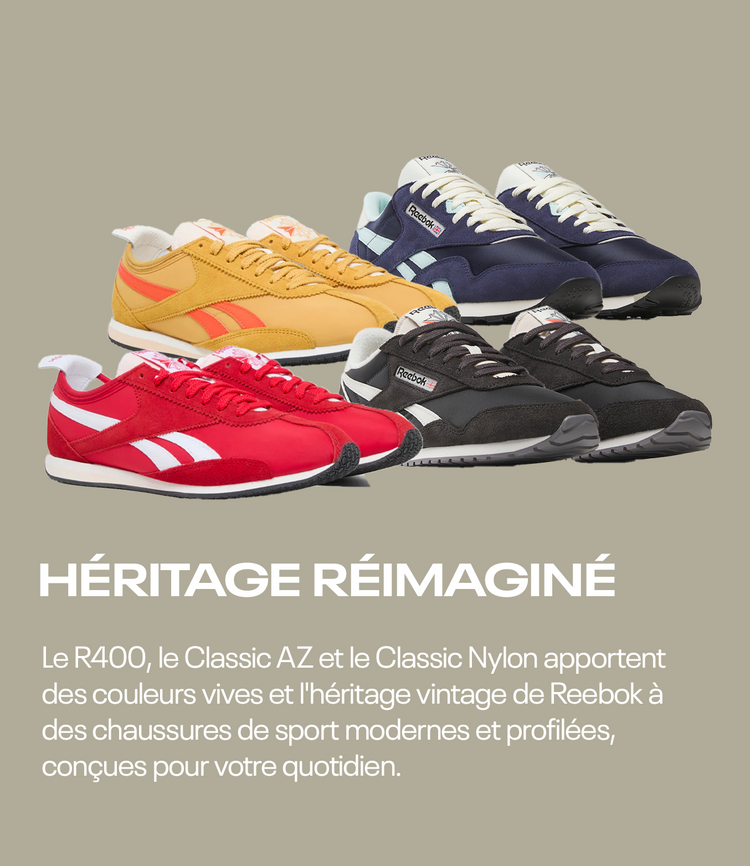 La R400, inspirée d'une chaussure de course des années 70, offre une silhouette élégante avec un daim saturé et un design tiré de l'une des premières chaussures de Reebok. La Classic Nylon, une favorite intemporelle depuis les années 80, apporte une touche athlétique rétro avec des textures superposées et des coloris polyvalents. Et pour elle, la Classic AZ offre un style épuré, inspiré des archives, conçu pour être porté au quotidien avec des touches de couleur audacieuses et une attitude rétro.