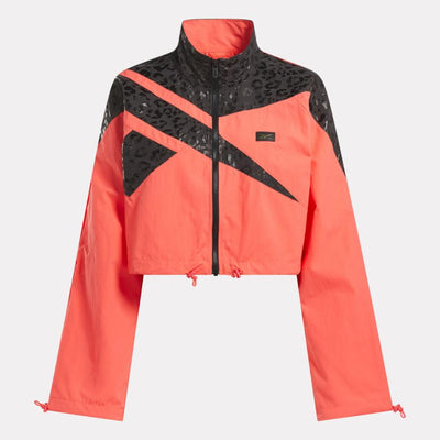 Unapologetic. Talented. Glamorous. Make Angel's attitude your own in this women's Reebok jacket. An oversized fit gives it a modern silhouette. A foil leopard print and gold chrome Vector branding add flash.