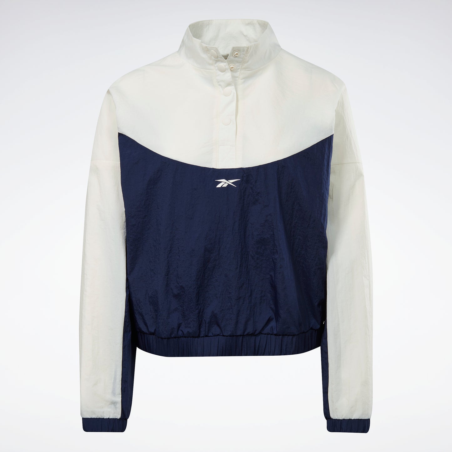 What goes around, comes around. Take this women's Reebok jacket. It's heritage-inspired design gives any outfit a boost of retro style. Woven fabric and loose cut make it sporty and easy to wear. Snaps and a stand-up collar add the finishing touches.