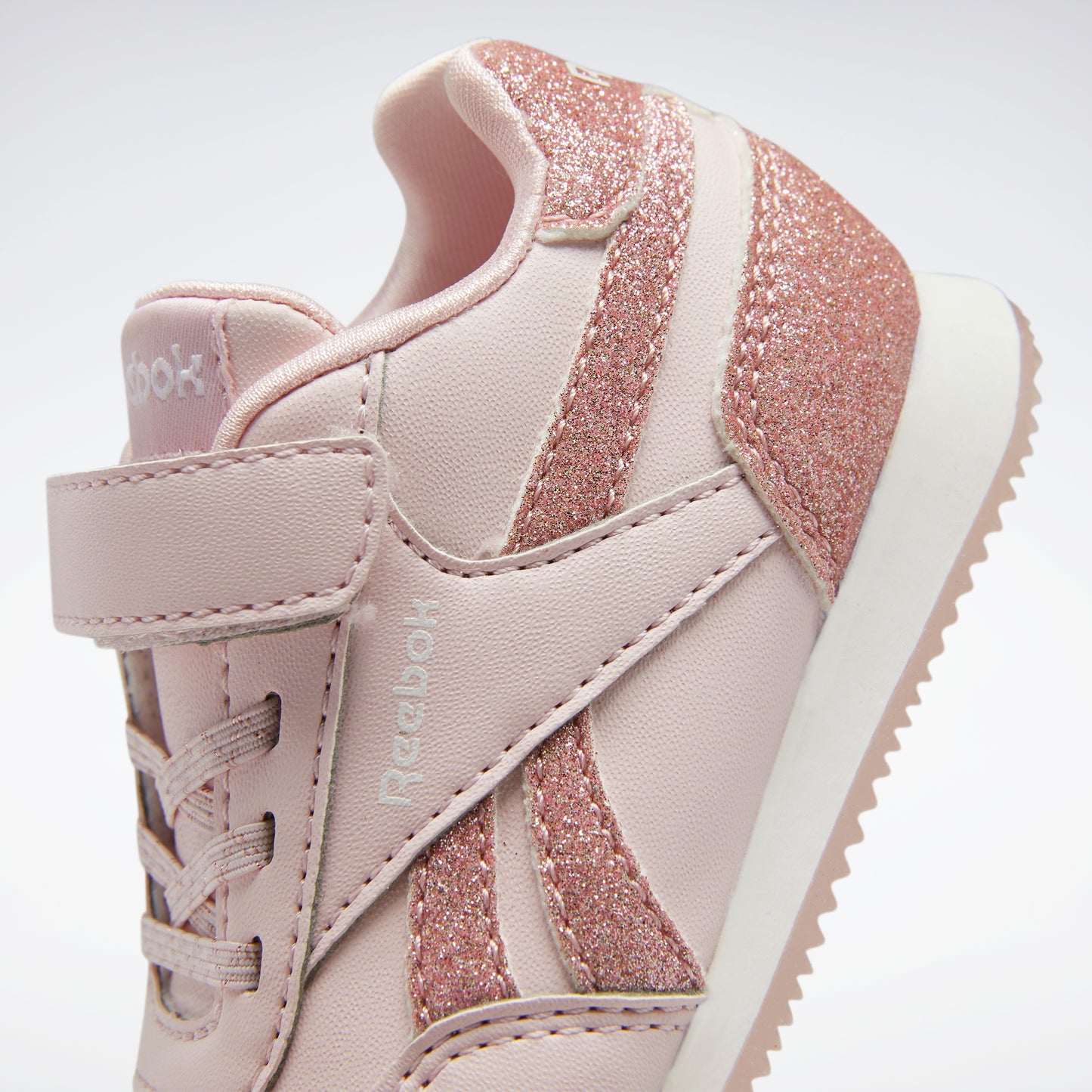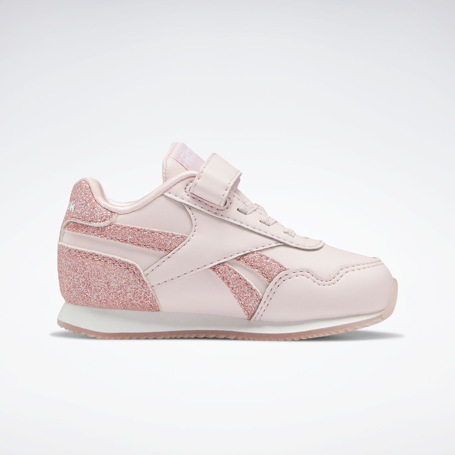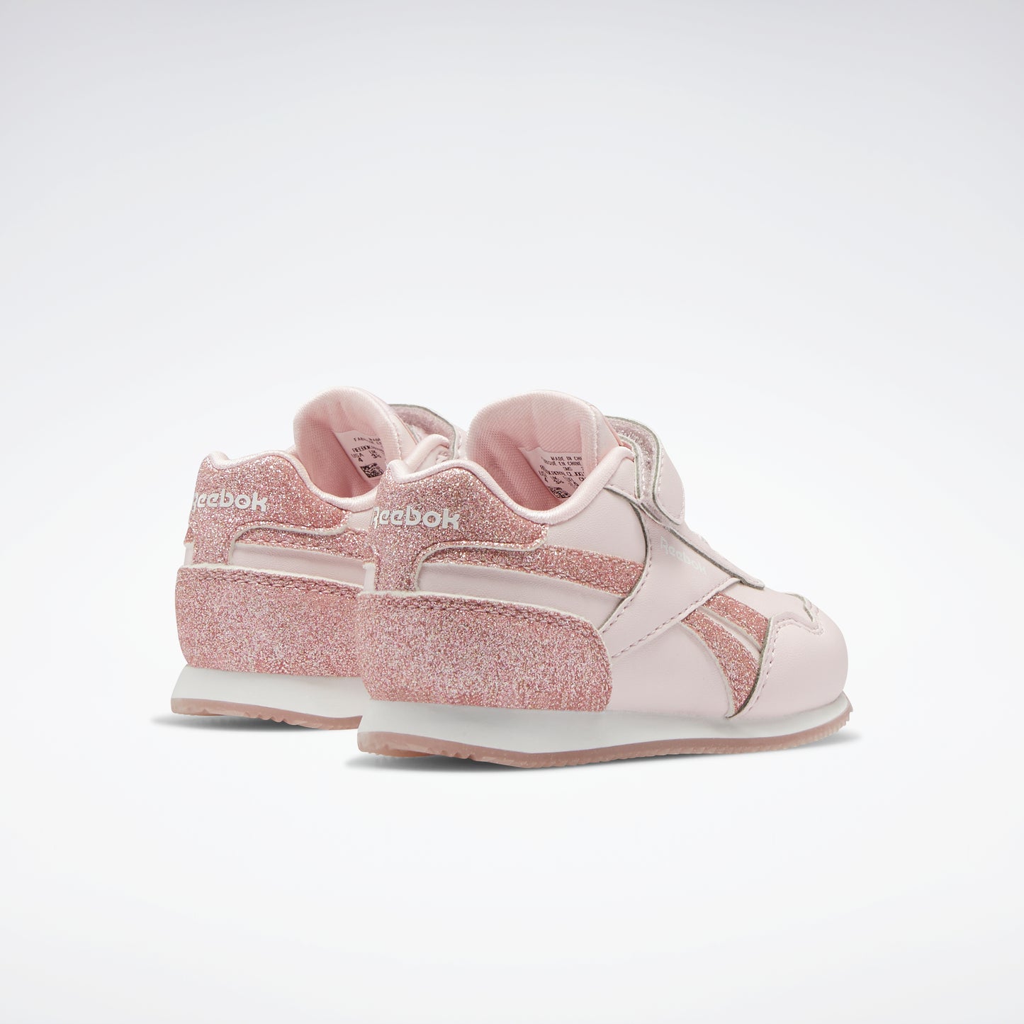 Add a little sparkle to her look. These infant girls' Reebok trainers have glittery accents on the side stripes to sprinkle some shine into her outfits. Inspired by '80s running shoes, they have a smooth synthetic upper and precise stitching for a classic look.