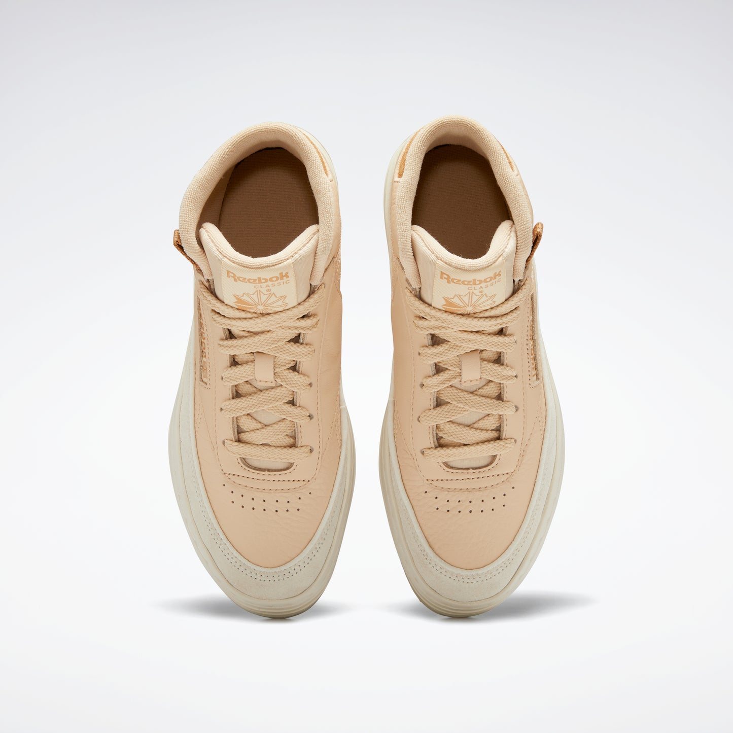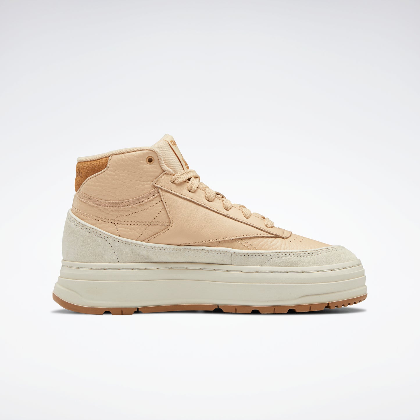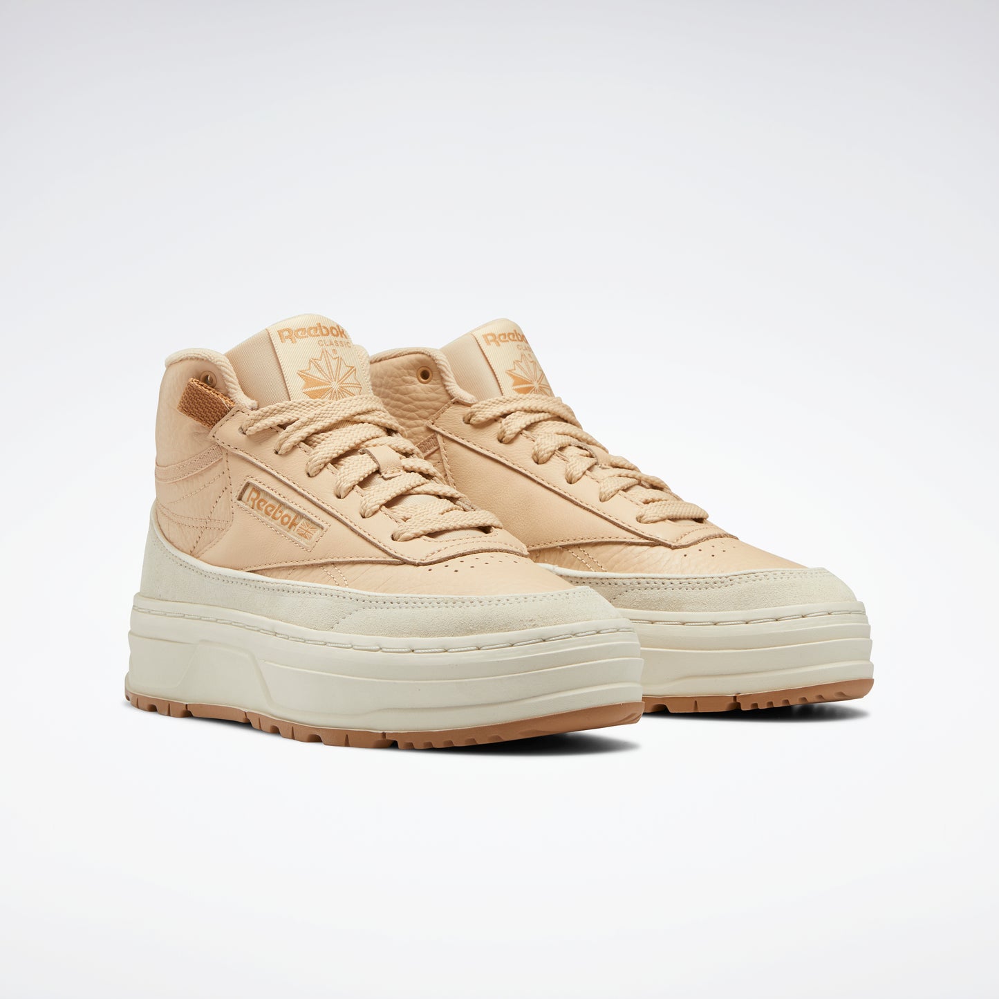 These women's Reebok shoes prove it's possible to have a look that's both fierce and chic. A thick outsole tread, suede mud guard and mid-cut collar echo outdoor style. Supple leather and soft suede elevate your new go-to shoe. The platform midsole takes you to new heights — literally. A neutral colour palette means you can pair them up with almost anything for extra versatility.