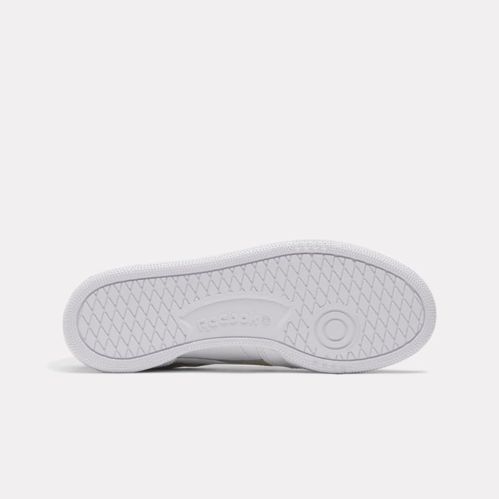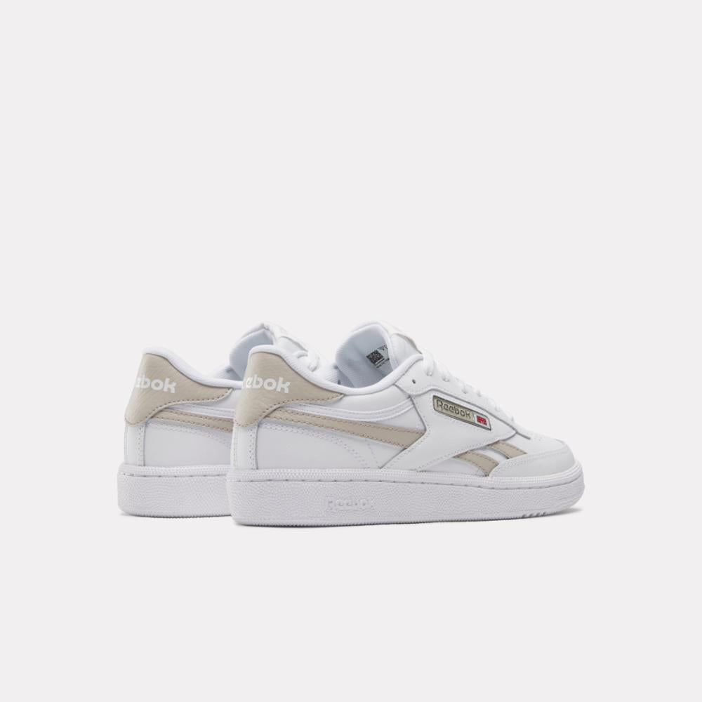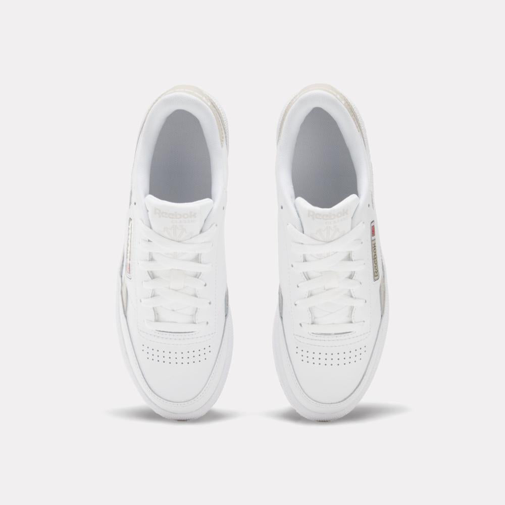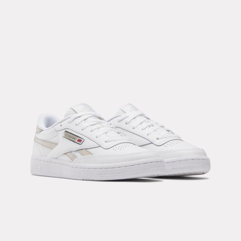 The Reebok Club C Revenge shoes dropped in 1987 for tennis players. These women's sneakers are a fresh take on the instant classic. The upper is a master mix of full leather and tumbled leather side stripes. A molded metal Union Jack logo in the windowbox give these kicks a chrome treatment.